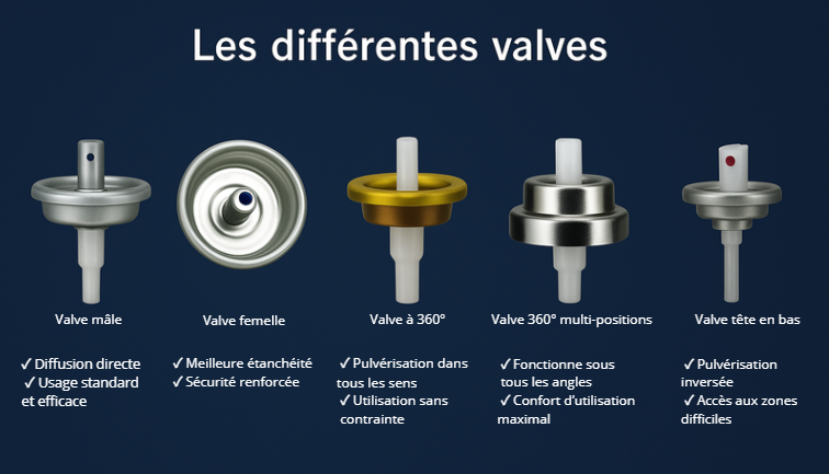 Pour finir, nous allons voir les différents gaz qui permettent au produit d’être expulsé du boîtier. Chaque gaz a des propriétés différentes et est choisi selon l’usage de l’aérosol. Le gaz propulseur maintient le produit sous pression et assure une diffusion constante :